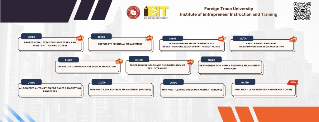 Institute of Entrepreneur Instruction and Training (iEIT) was established under the Decision No. 779/QD-ĐHNT-TCHC dated June 17, 2011 of the Rector of Foreign Trade University, operating on the principle of financial autonomy, with own seal and account.We develop with the goal of building a training and consulting unit that meets the highest requirements of customers, ensuring the best conditions for members to create and develop. In addition, iEIT wishes to create scientific products and training and consulting services with high added value, maximum satisfaction of customers’ needs, and knowledge creation connection to serve businesses. and Community. During 10 years of operation, iEIT is always proud of maintaining 3 core values: Creativity, Efficiency and Professionalism.