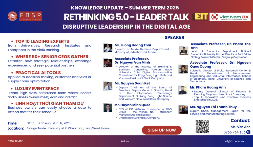 Institute of Entrepreneur Instruction and Training (iEIT) was established under the Decision No. 779/QD-ĐHNT-TCHC dated June 17, 2011 of the Rector of Foreign Trade University, operating on the principle of financial autonomy, with own seal and account.We develop with the goal of building a training and consulting unit that meets the highest requirements of customers, ensuring the best conditions for members to create and develop. In addition, iEIT wishes to create scientific products and training and consulting services with high added value, maximum satisfaction of customers’ needs, and knowledge creation connection to serve businesses. and Community. During 10 years of operation, iEIT is always proud of maintaining 3 core values: Creativity, Efficiency and Professionalism.